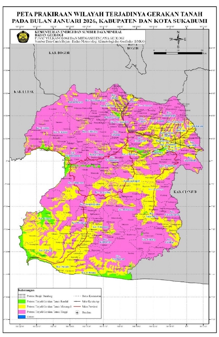 Gambar 1 : Peta Prakiraan Wilayah Terjadinya Gerakan Tanah pada Bulan Januari 2026 Kabupaten dan Kota Sukabumi (Sumber : https://vsi.esdm.go.id/portalmbg)