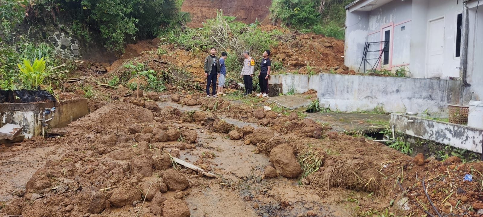 Hingga Jumat siang, sisa longsoran berupa tanah dan air masih memenuhi area pemukiman. Warga dibantu aparat lingkungan terpaksa membersihkan material longsor dengan alat seadanya.