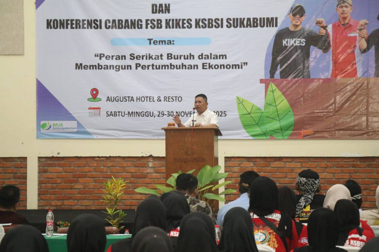 SUKABUMI, Topik Berita – Wakil Bupati Sukabumi Andreas secara resmi membuka Rapat Kerja Wilayah (Rakerwil) Konfederasi Serikat Buruh Seluruh Indonesia (KSBSI) Jawa Barat sekaligus Konferensi Cabang (Konfercab) Federasi Serikat Buruh Kimia, Industri Umum, Farmasi, dan Kesehatan (FSB KIKES) Sukabumi, Sabtu (29/11/2025). Kegiatan tersebut berlangsung di Hotel Augusta, Cikukulu, Kabupaten Sukabumi.